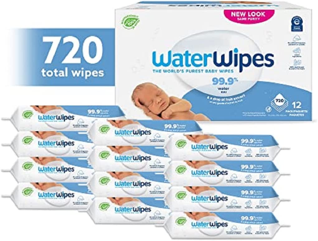 WaterWipes Plastic-Free Original Baby Wipes, 99.9% Water-Based Wipes, Unscented Hypoallergenic for Sensitive Skin, 720 Tablets (Pack of 12), Packaging May Vary